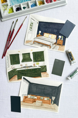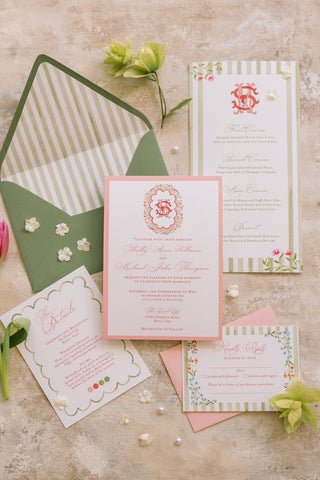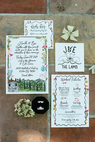 Hand-painted artwork—venue sketches, crests, botanicals, and more—translated into clean design layouts and thoughtful materials for a suite that feels like you.