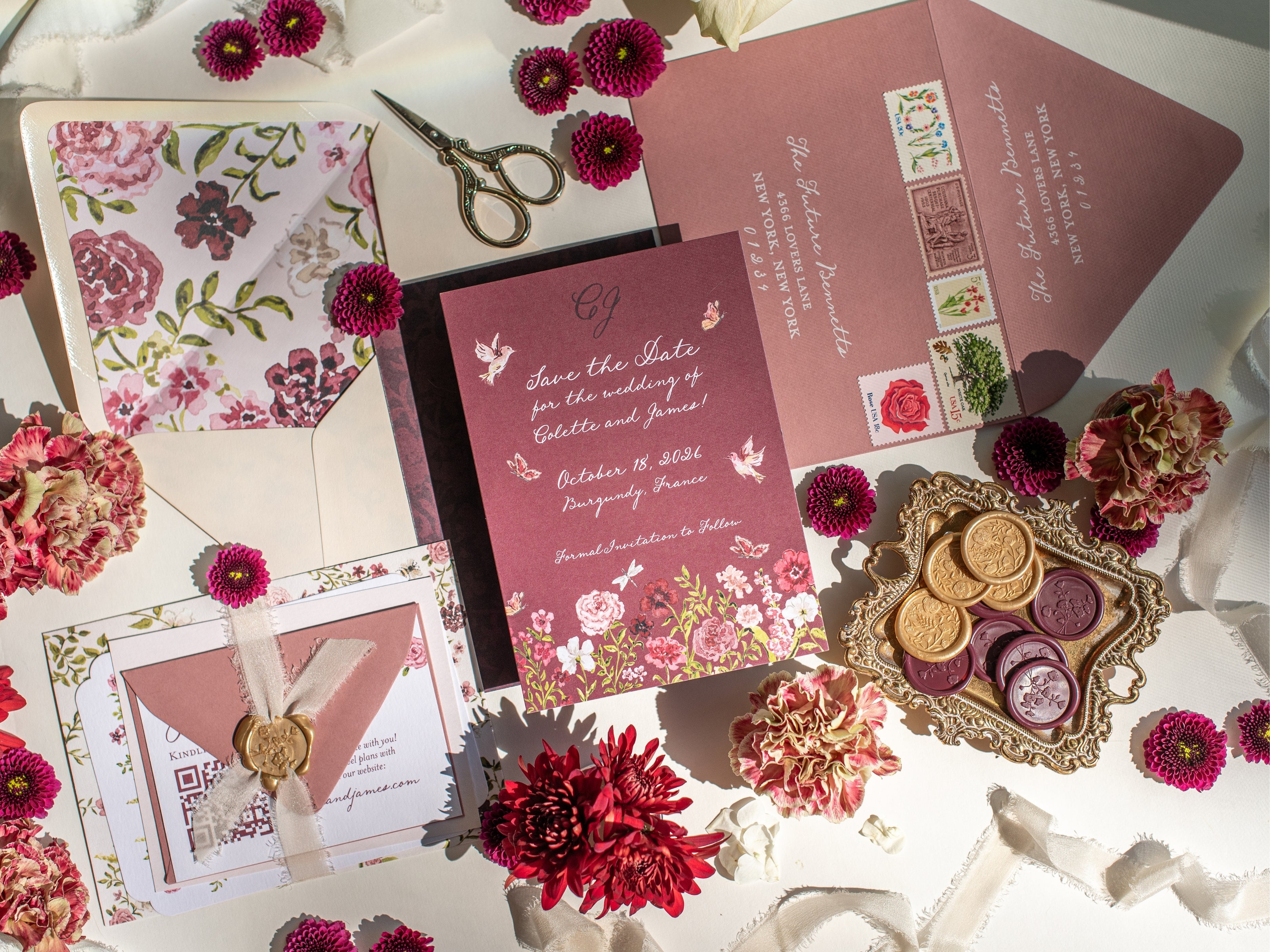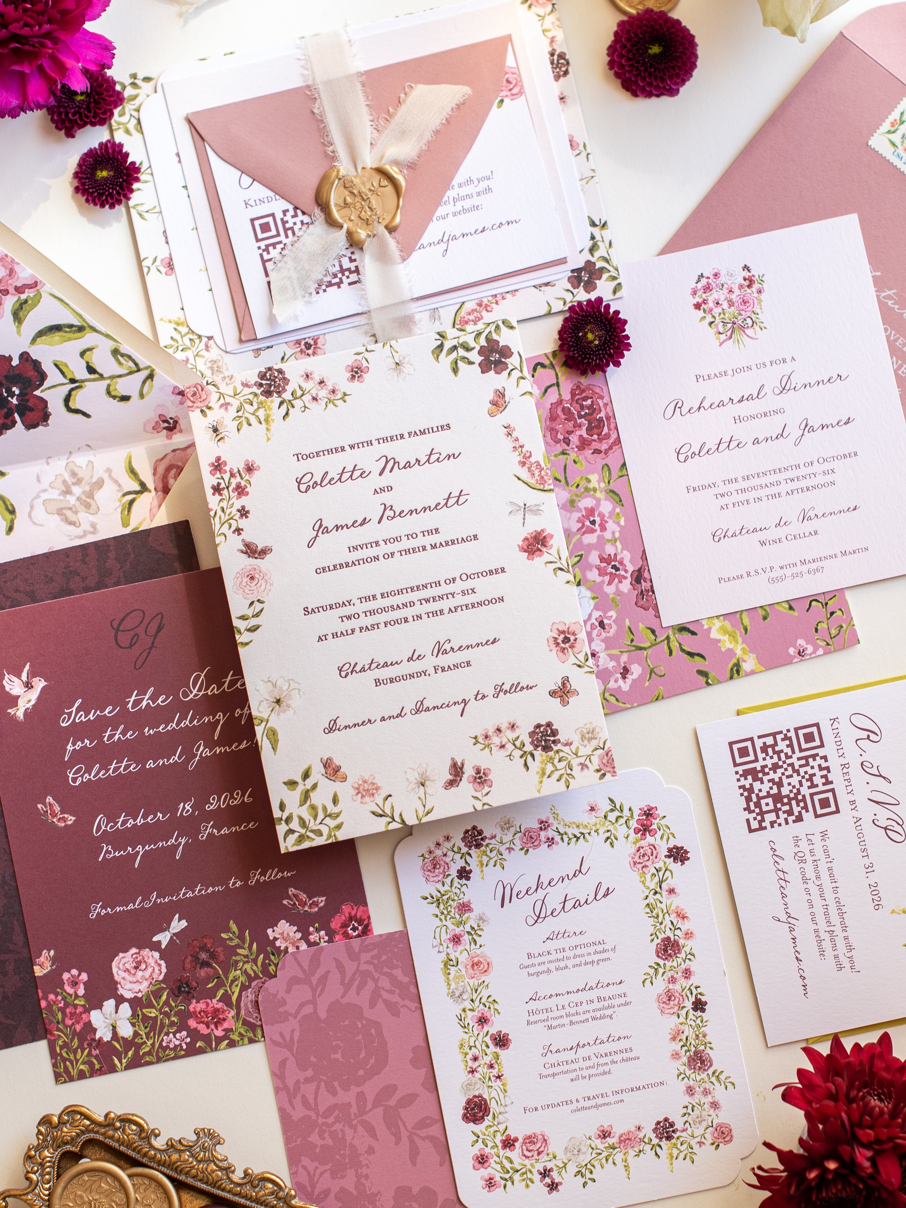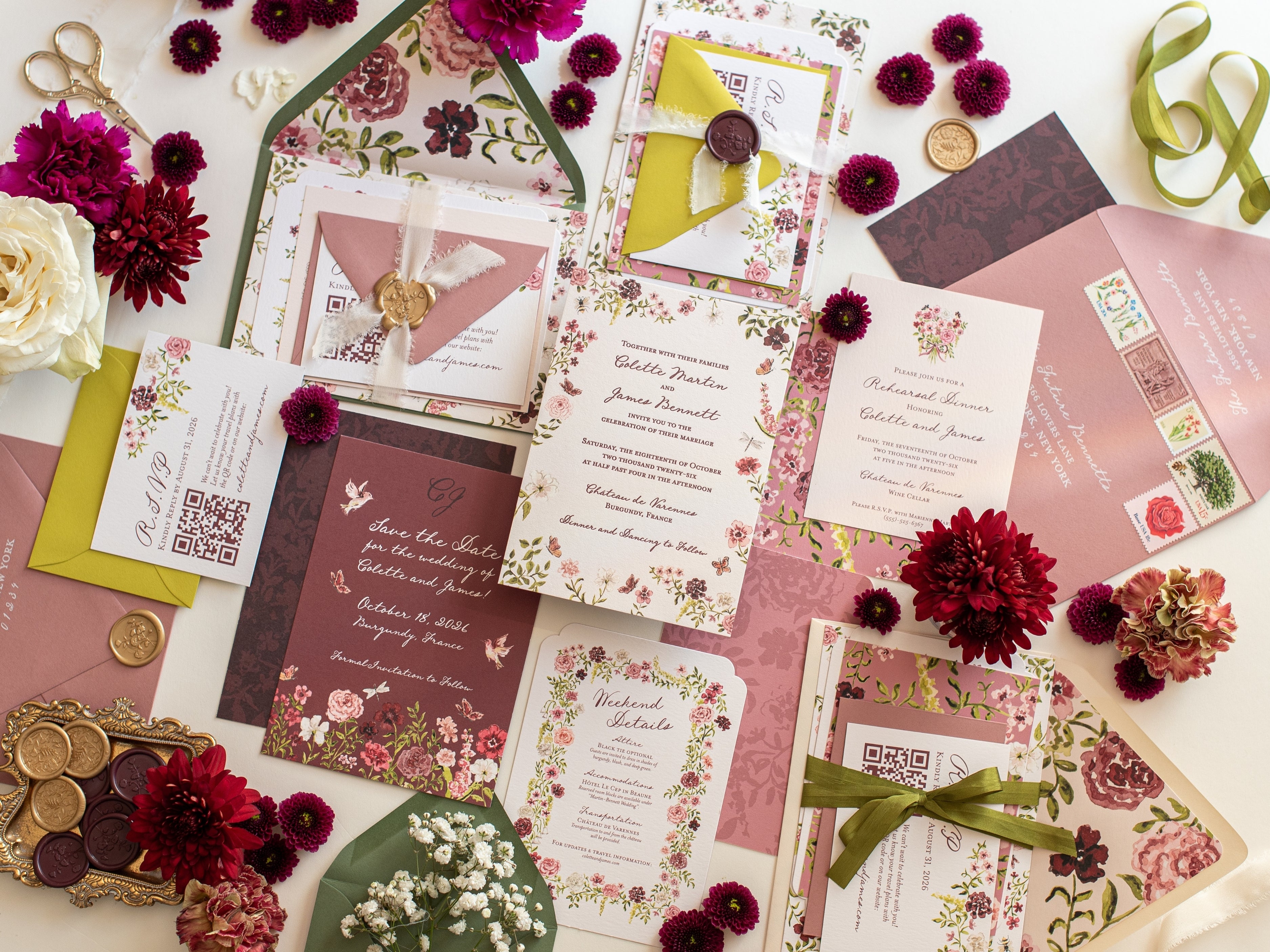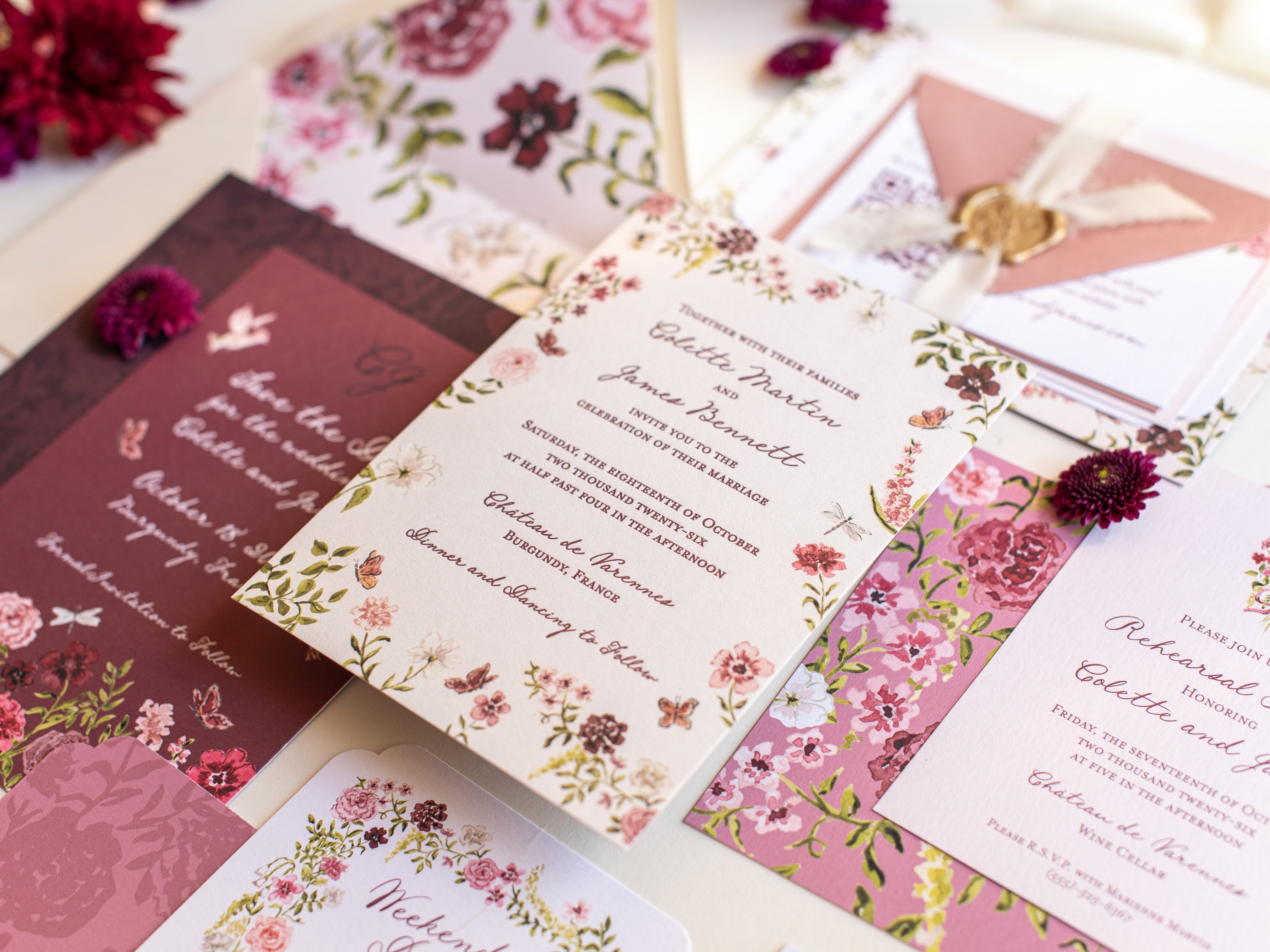 Deep berry, rose, and blush florals with tonal patterning give Colette a rich, romantic presence—warm, textural, and elegant. It’s a sophisticated spin on burgundy floral wedding invitations, equally at home in a city ballroom or garden setting.