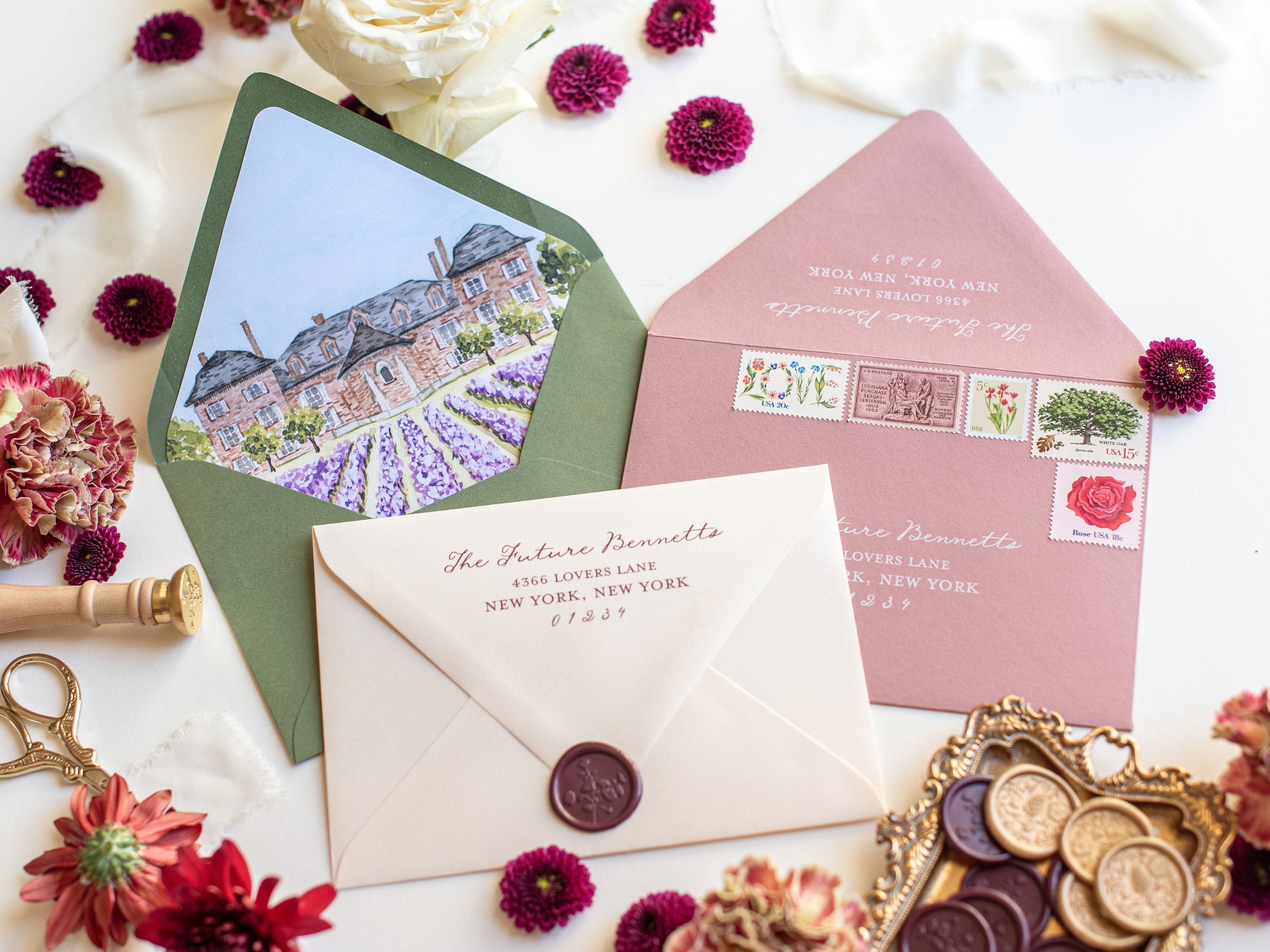 Wording, text colors, envelope choices, and minimal layout changes - the core artwork remains the same. Additional custom artwork can be added on for additional costs, such as a venue painting, pet painting, custom map, etc. We also have curated wax seals and ribbon options to further embellish your suite.