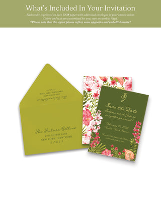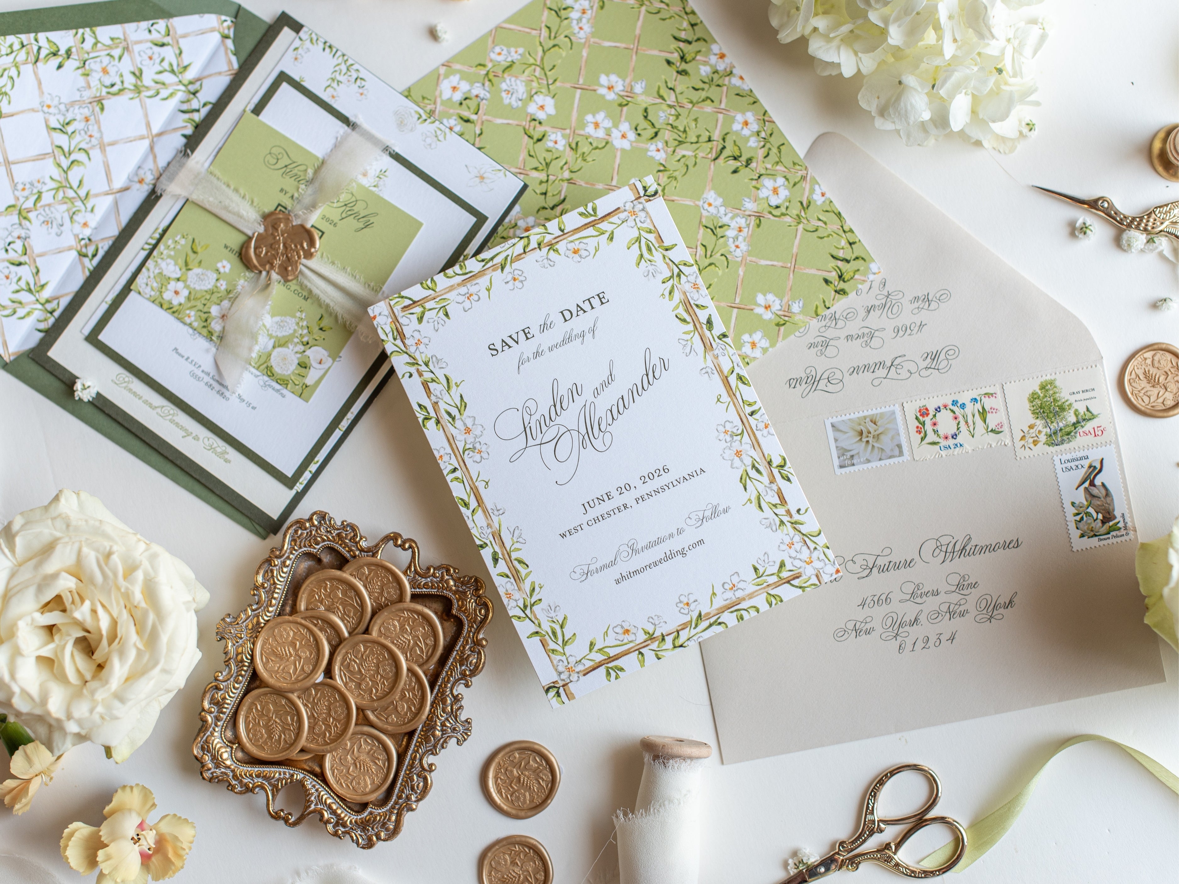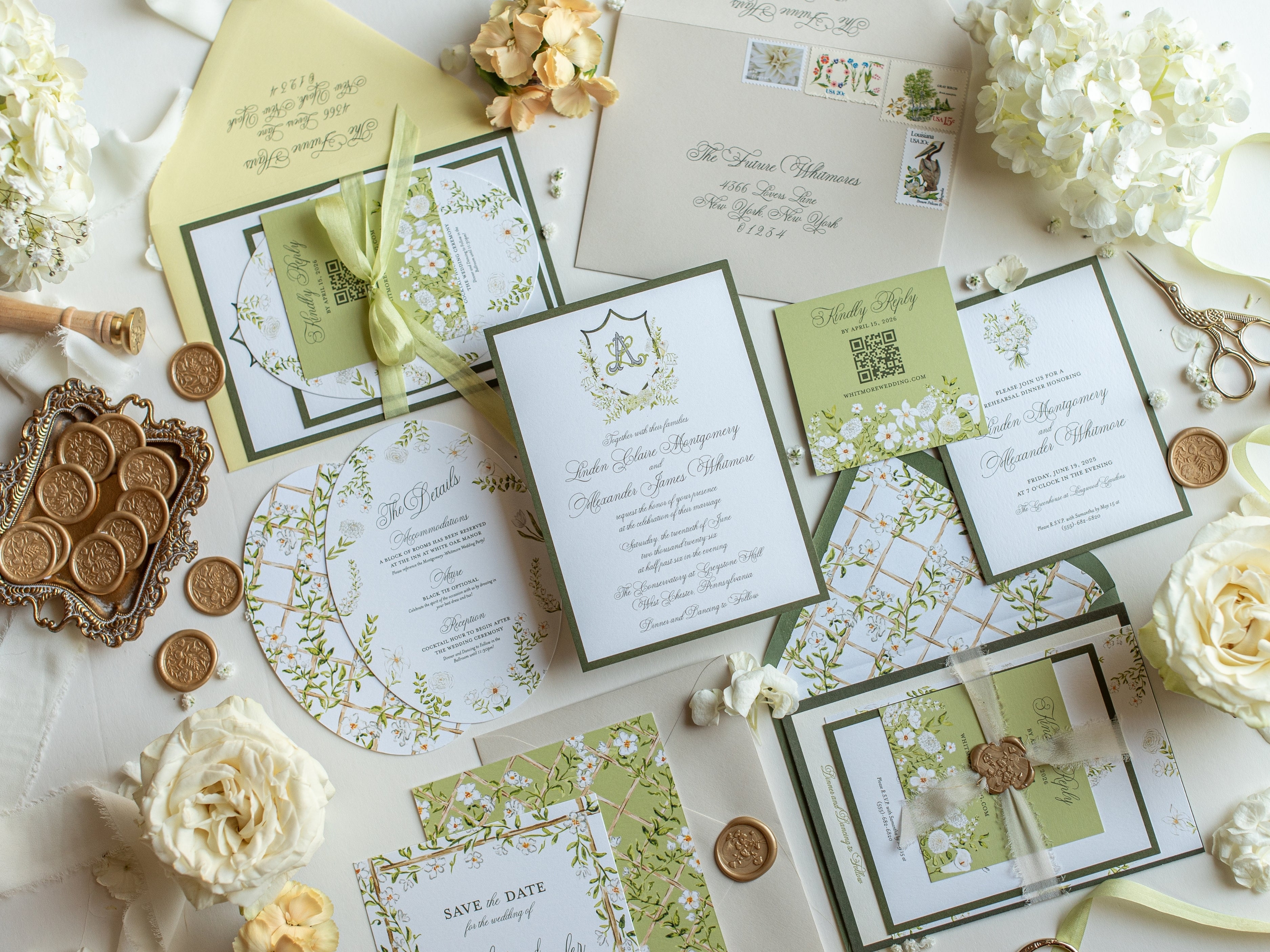 Hand-painted botanical greenery in layered sage and olive meets modern-classic type and a classic, yet playful design. Calm, tailored, and easy to read, Linden brings a refined garden feel to estate and vineyard weddings—a contemporary take on sage-green, botanical greenery wedding invitations that stays timeless but adds a touch of whimsy.