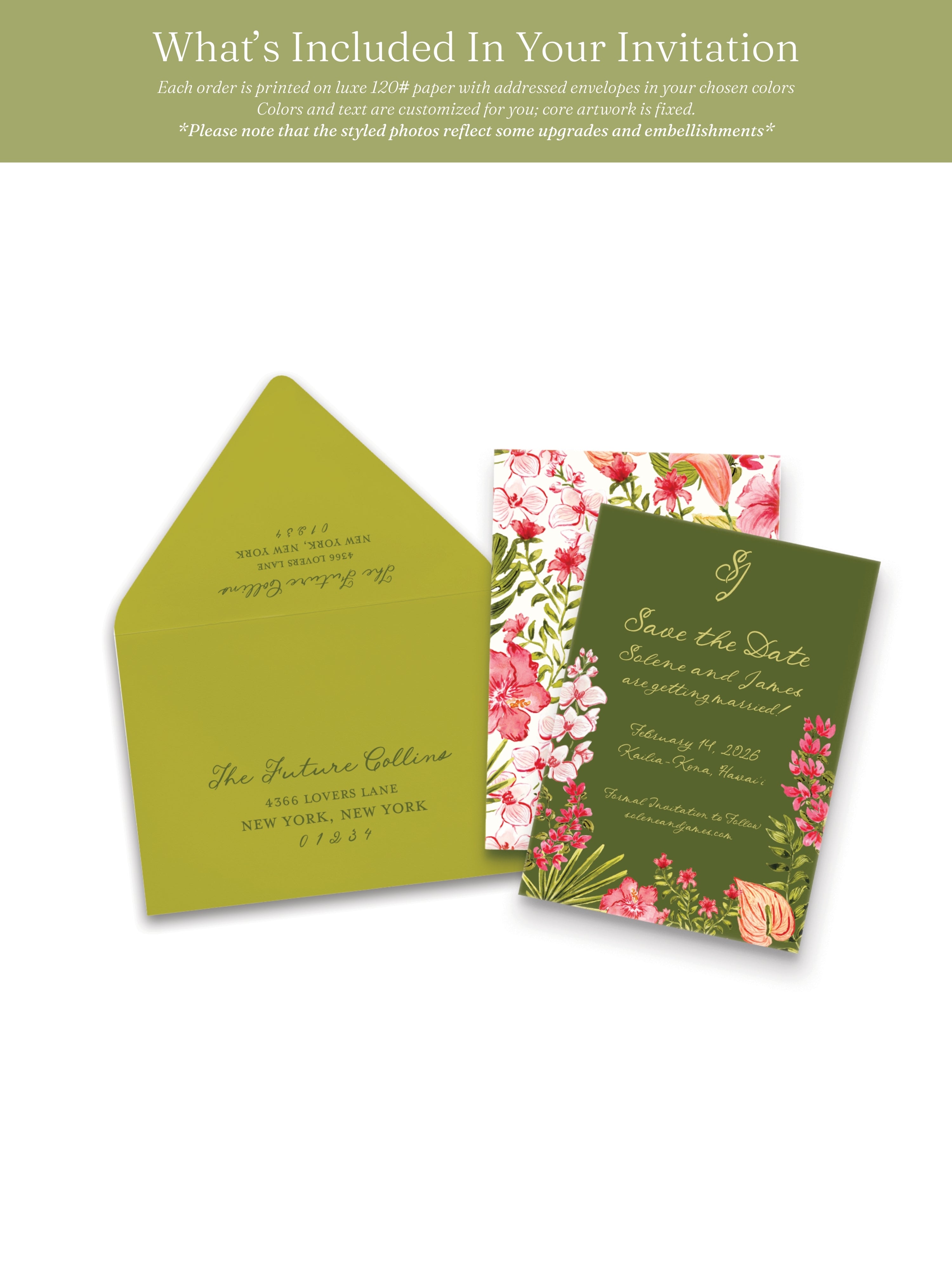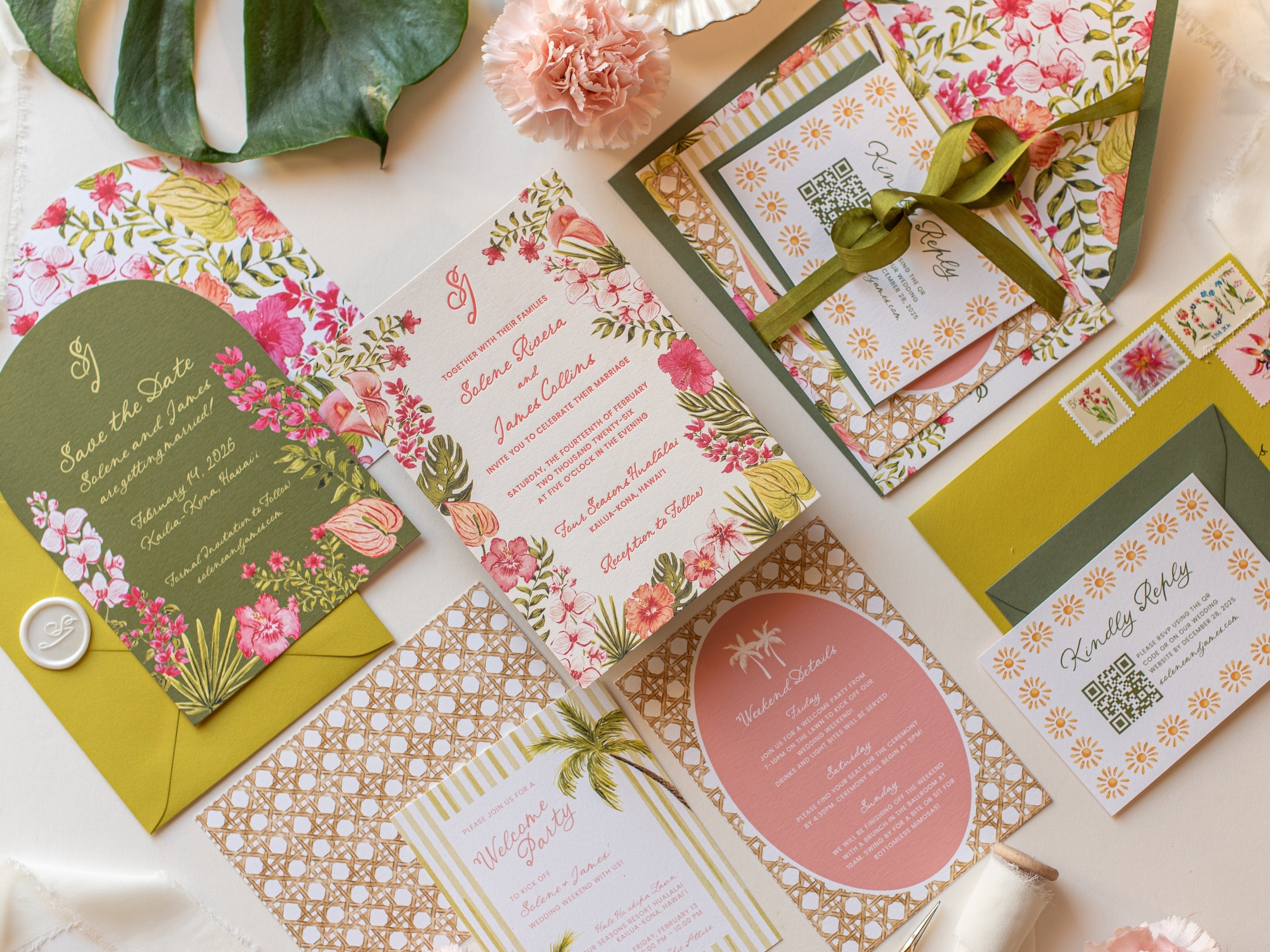 Hand-painted tropical florals in coral, blush, and leafy green meet cane-rattan patterning and modern type. Bright, sun-washed, and a little playful, Solene brings vacation-energy done elegantly—a fresh take on tropical wedding invitations with palms, stripes, and chic rattan details that still feel polished.